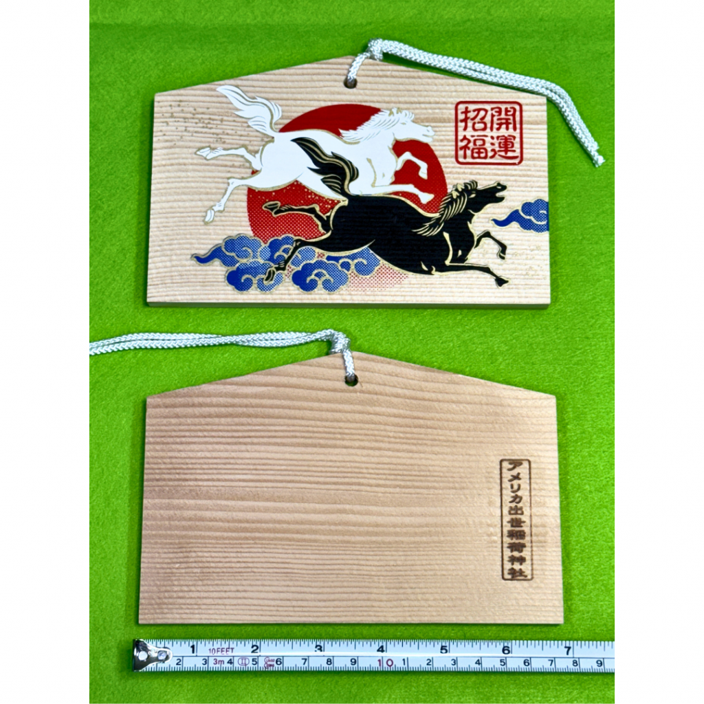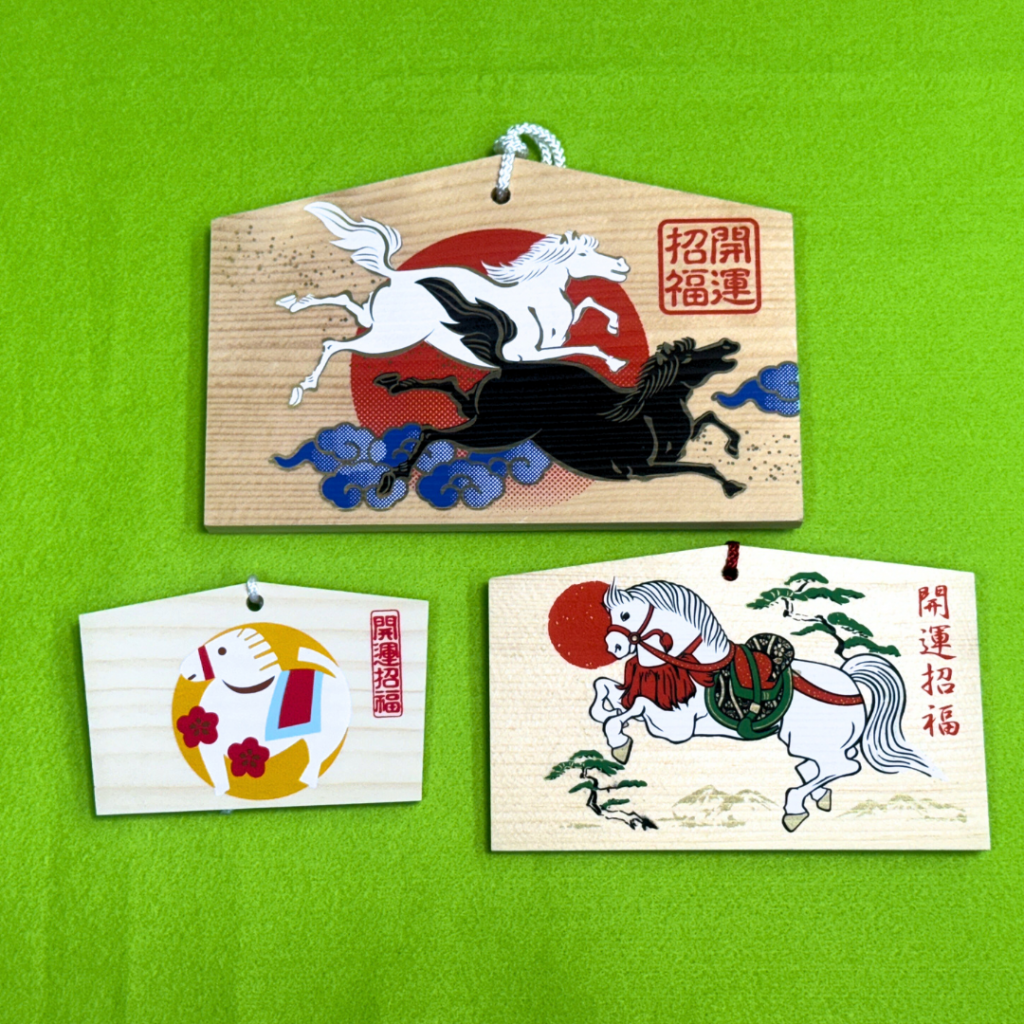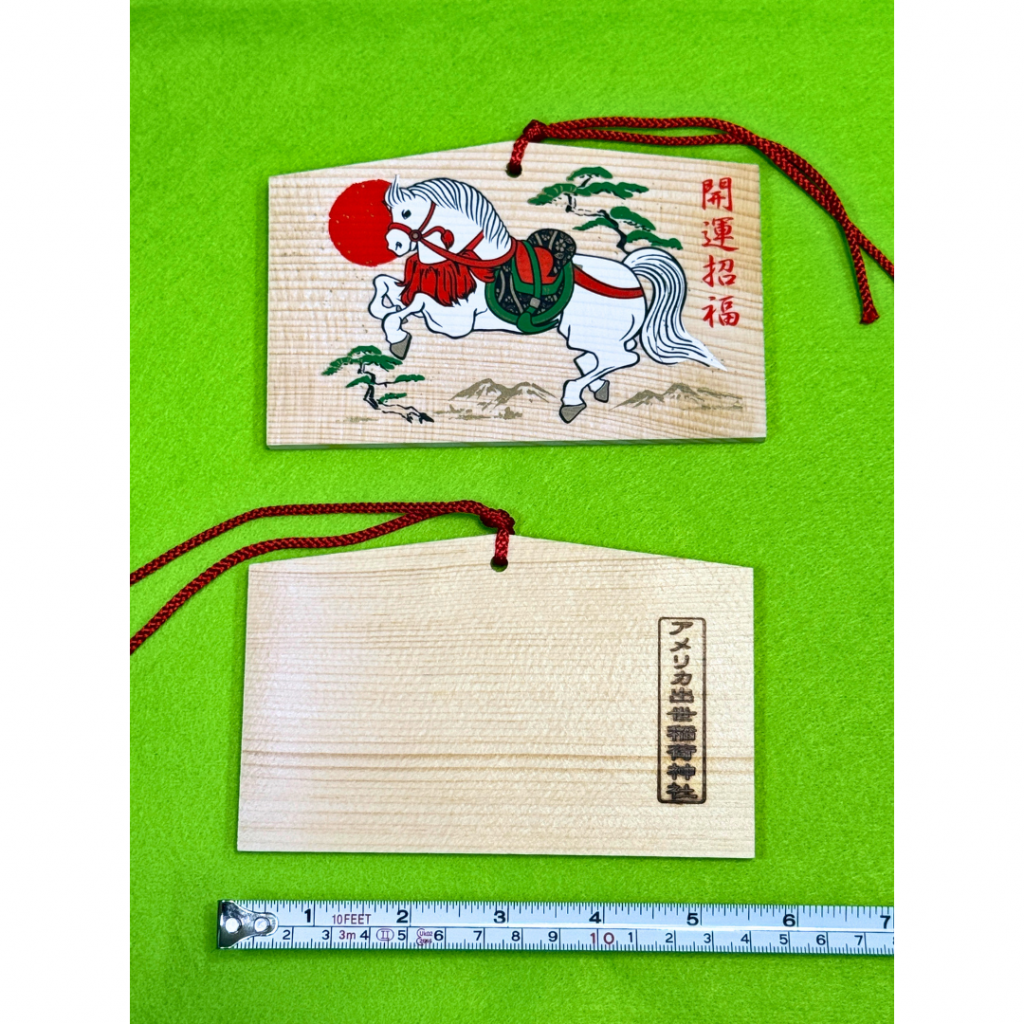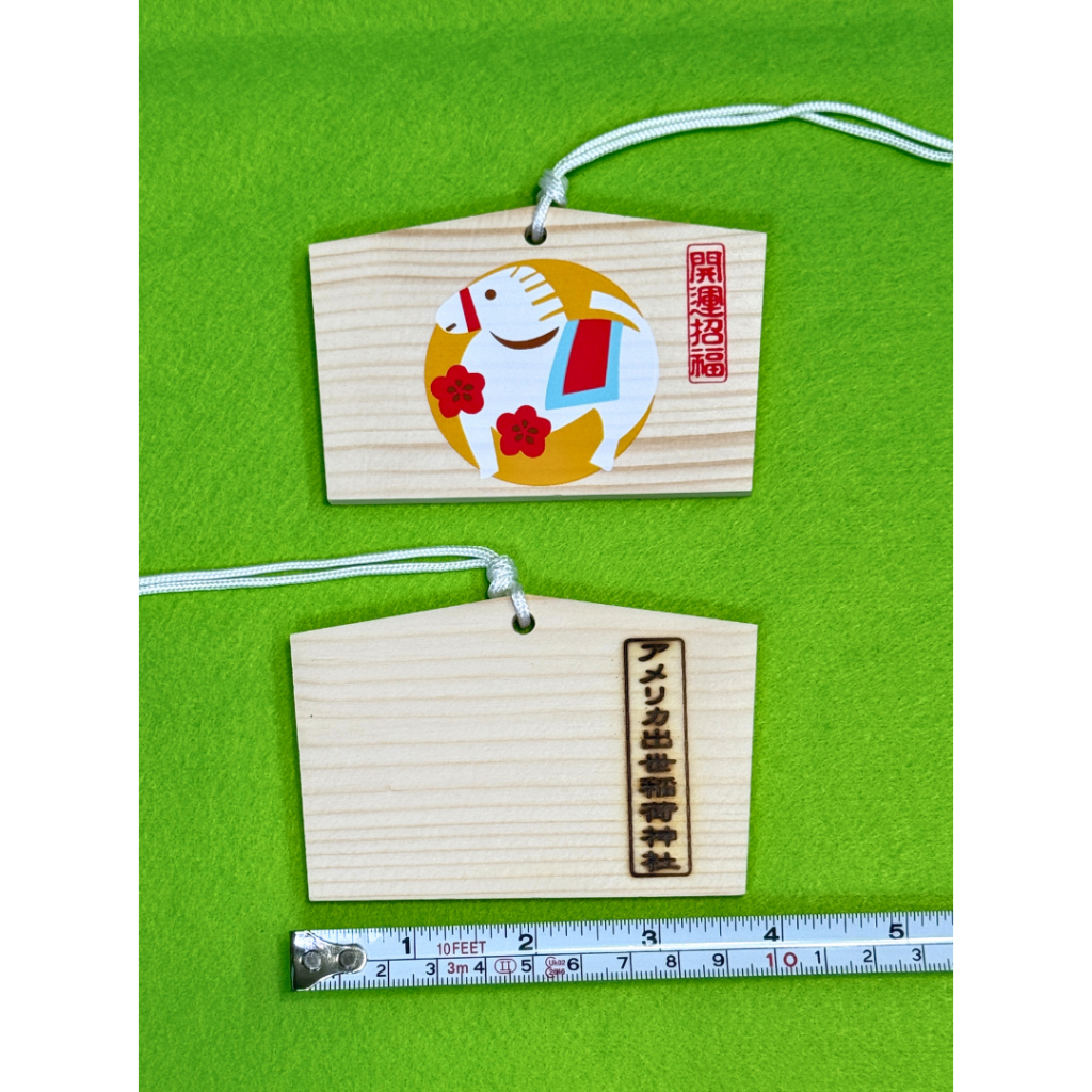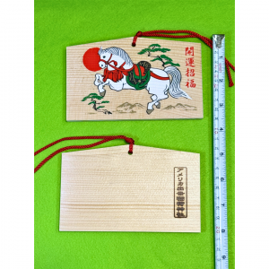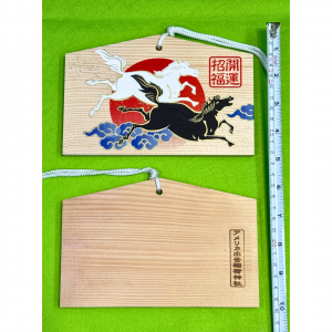 Ema is a wishing board. You write your wishes and dreams on the back. Please display the Ema high on the north or west wall, or put them on a shelf in your living room, workplace, or hang your Ema on the Ema hanger at the Shinto Shrine.